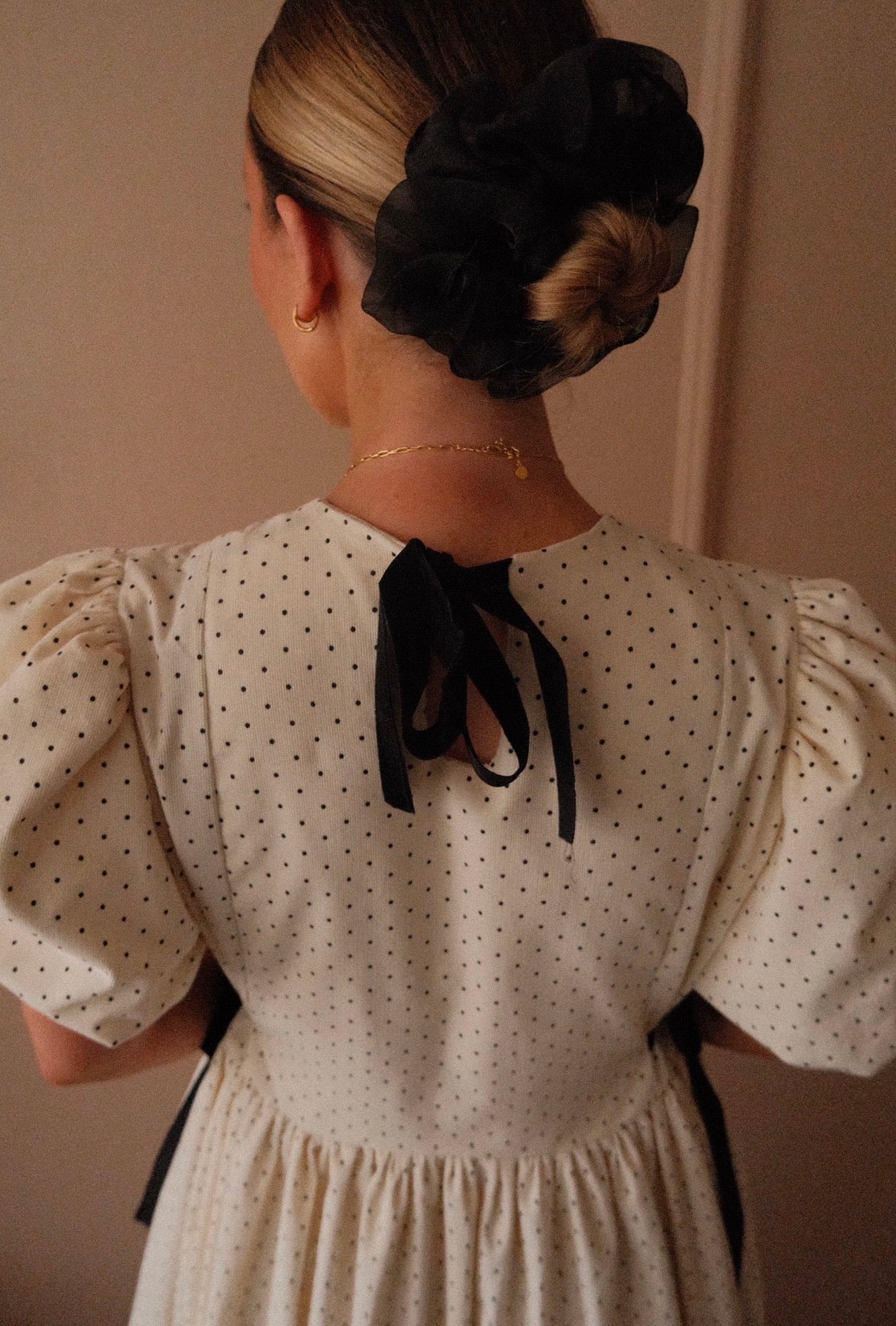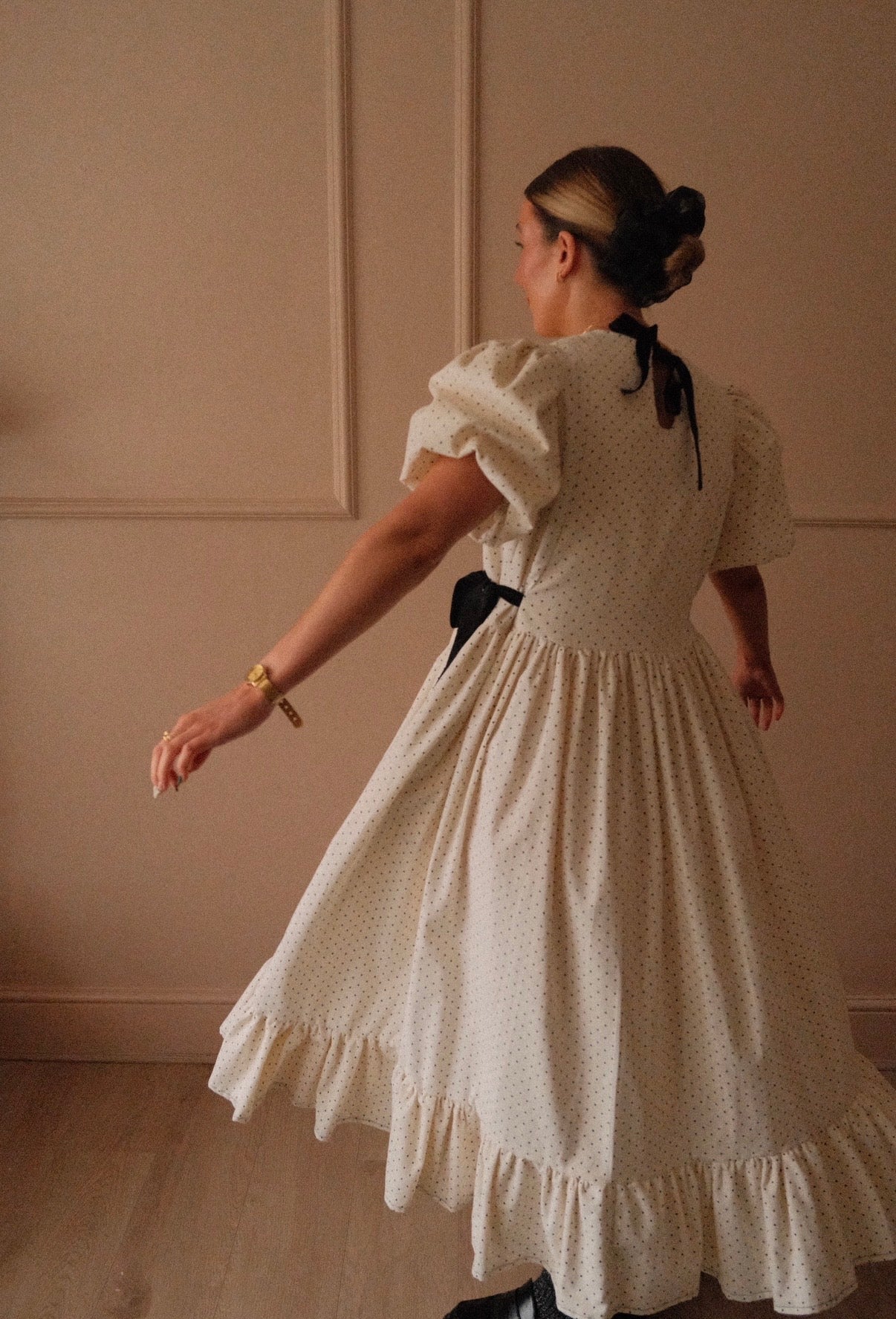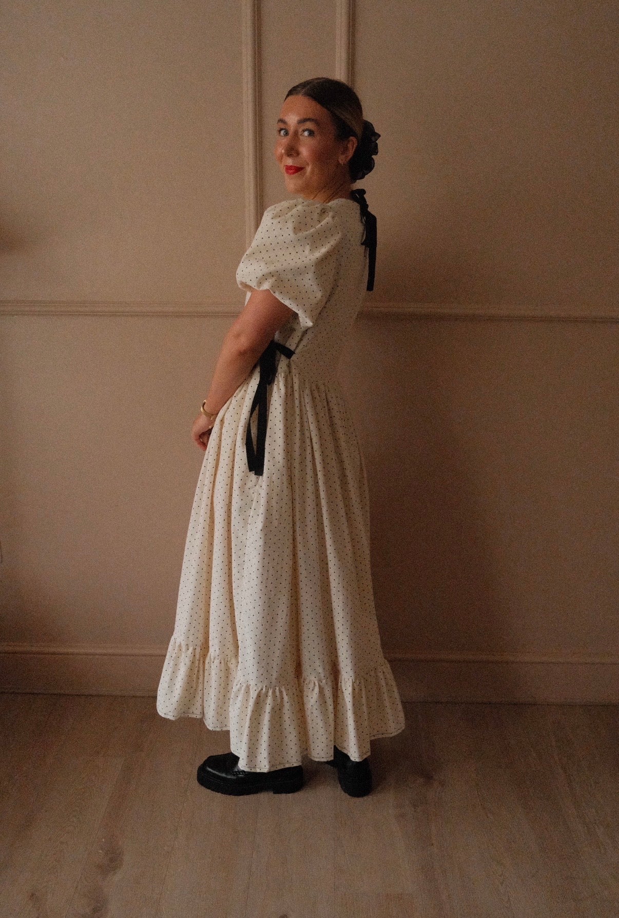 She’s made from 100% cotton needlecord corduroy fabric in the sweetest micro polka dot. She’s taken from our bestselling Beatrix style from the summer, but a short double lined puffed sleeve has been added as well as more volume in the skirt for the perfect swish! She’s finished with black velvet bows to the side that you can cinch in for a more fitted look and she’s ties at the back neck with a velvet black bow