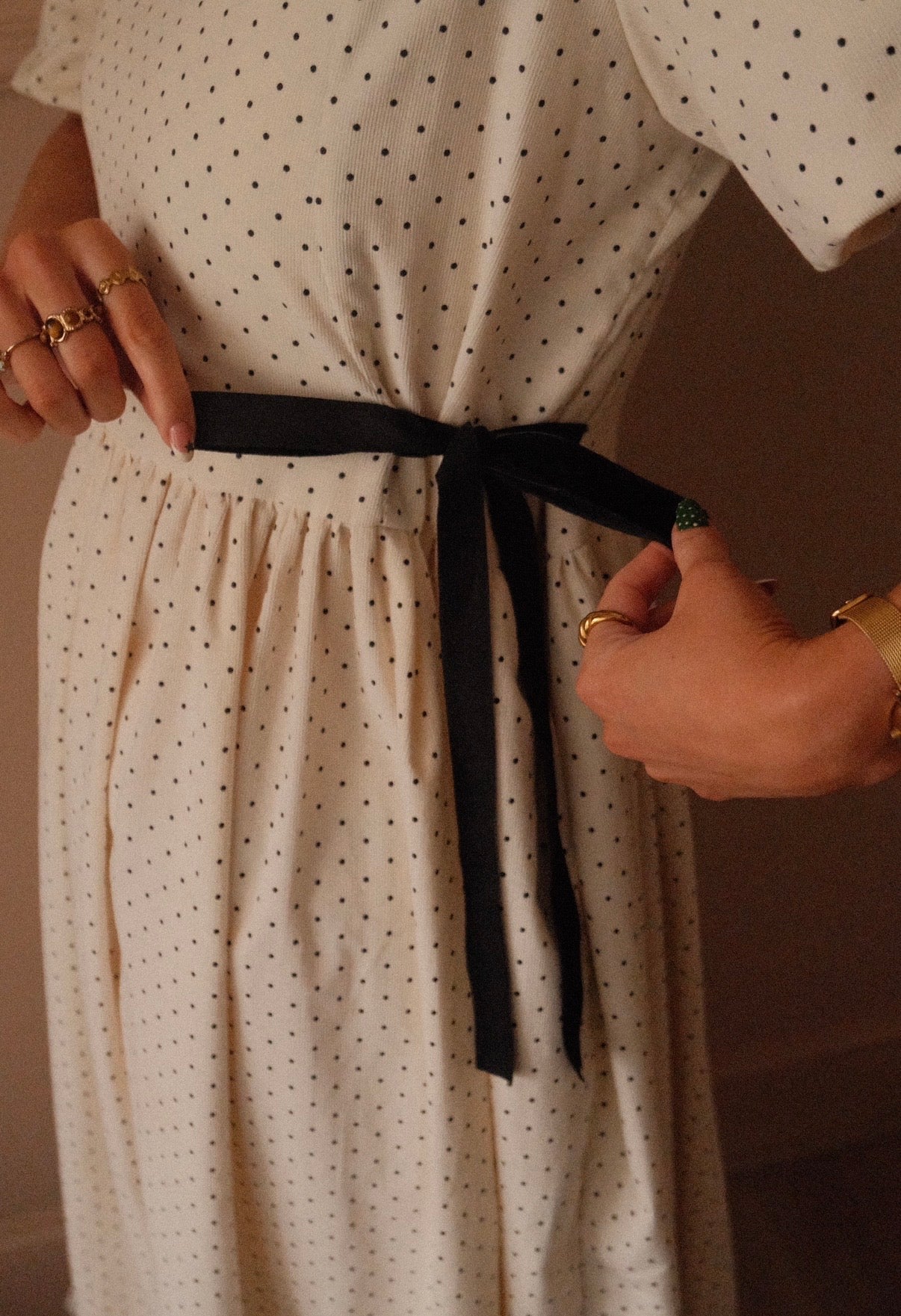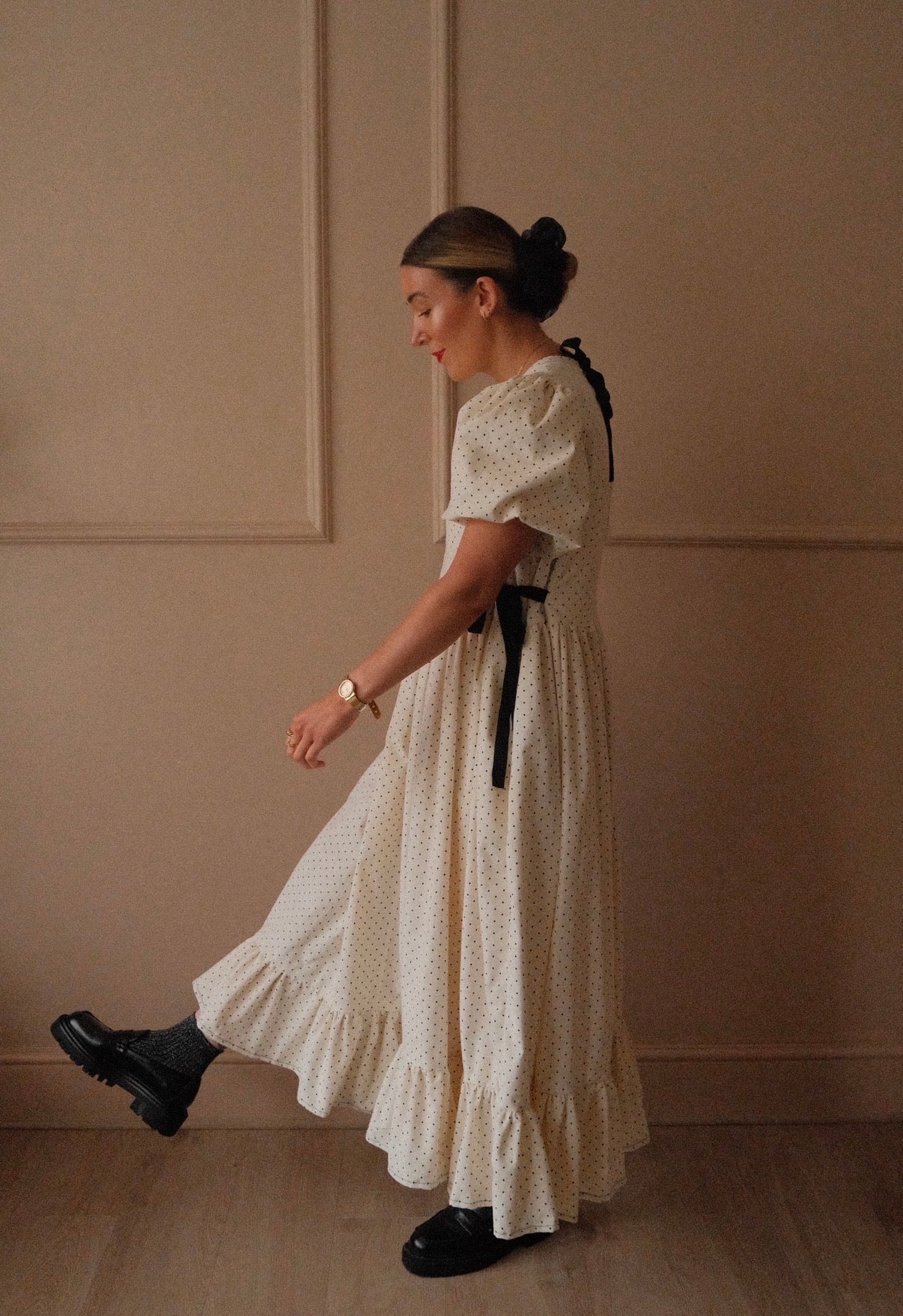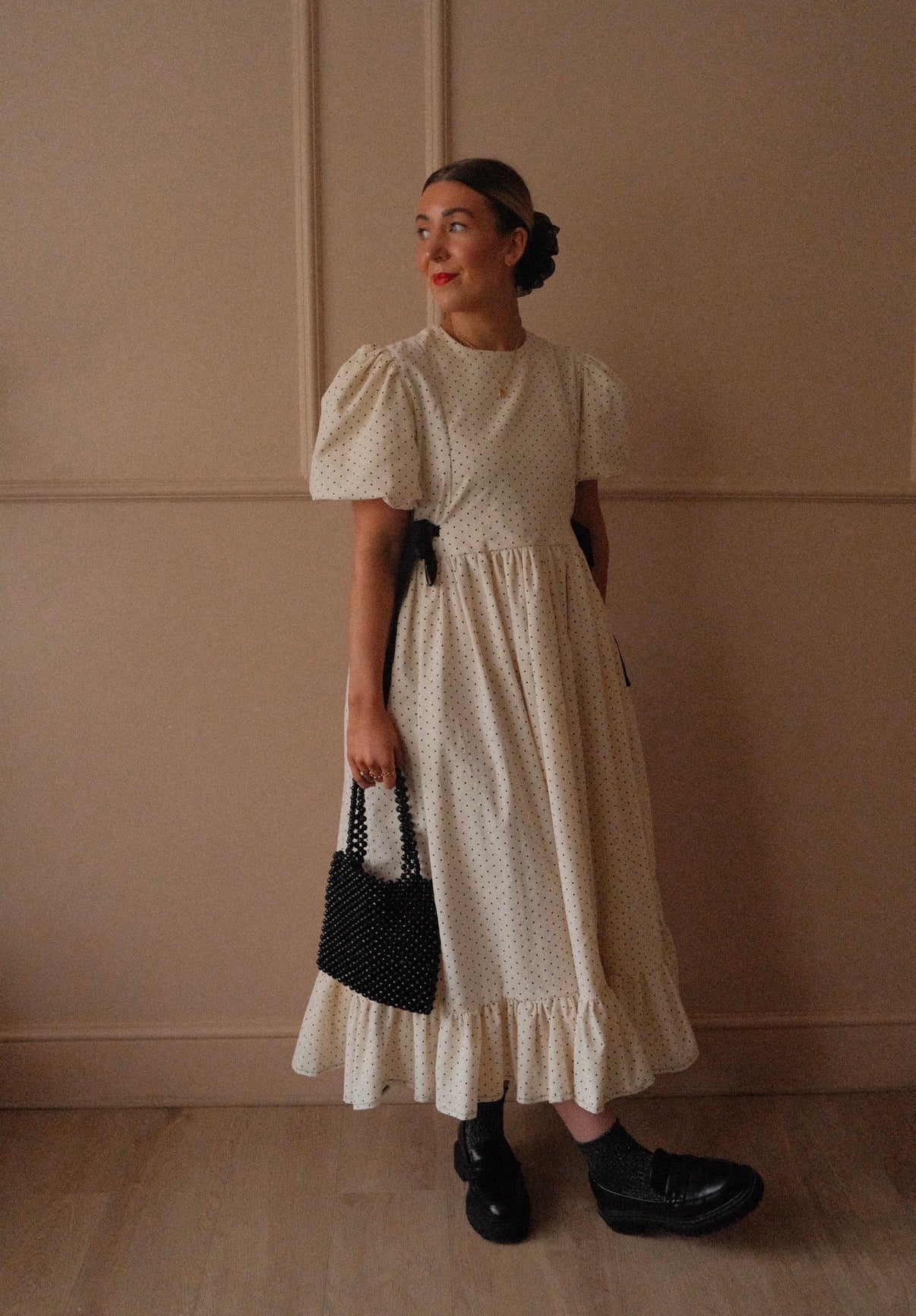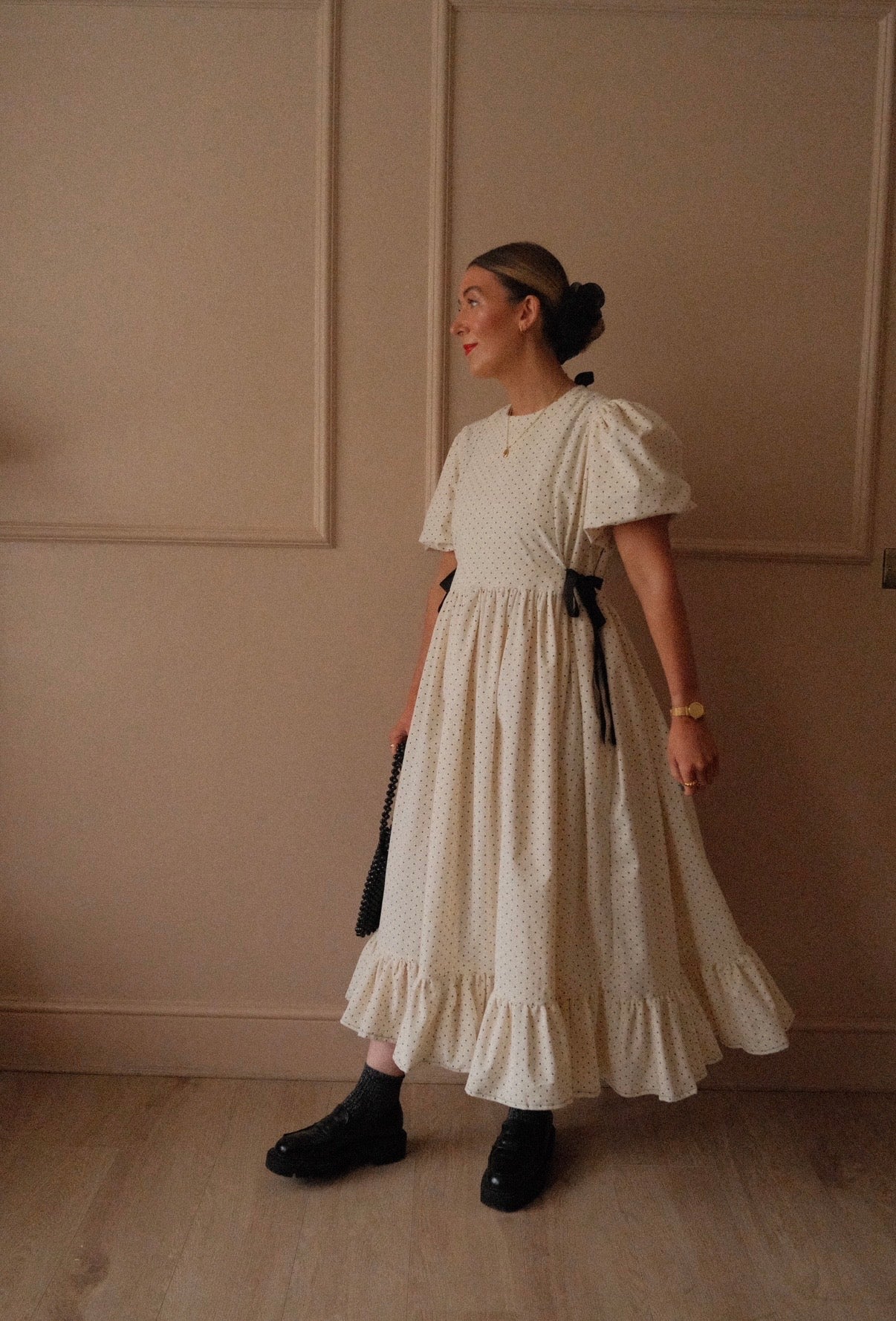 She’s made from 100% cotton needlecord corduroy fabric in the sweetest micro polka dot. She’s taken from our bestselling Beatrix style from the summer, but a short double lined puffed sleeve has been added as well as more volume in the skirt for the perfect swish! She’s finished with black velvet bows to the side that you can cinch in for a more fitted look and she’s ties at the back neck with a velvet black bow