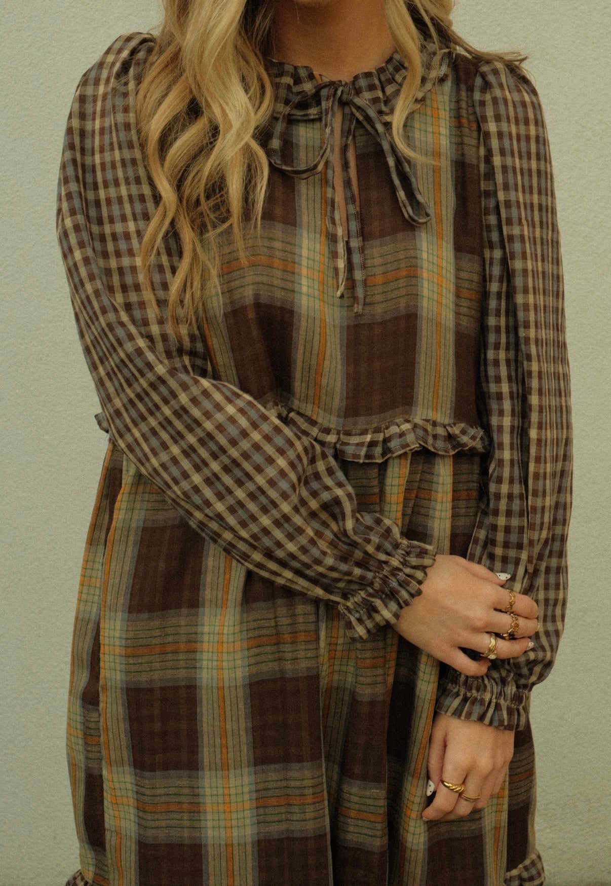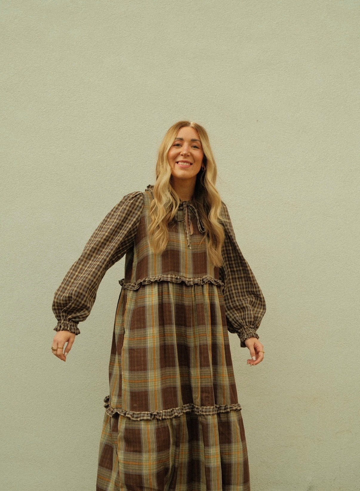 Made from 100% oeko-tex certified cotton double gauze in this amazing double sided check. I wanted to utilise both sides of the print so she has contrasting frills around the waist and middle of the skirt as well as contrasting frilled collar and sleeves. She ties at the front with a keyhole cut out and bow fastening